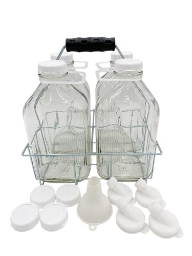 Wire Carrier with Glass Bottles, Extra Caps, Pour Spouts and Silicone Funnel Combos